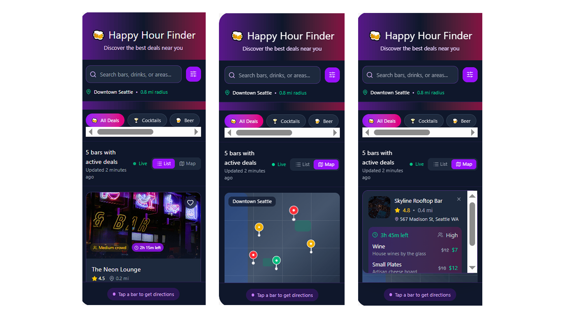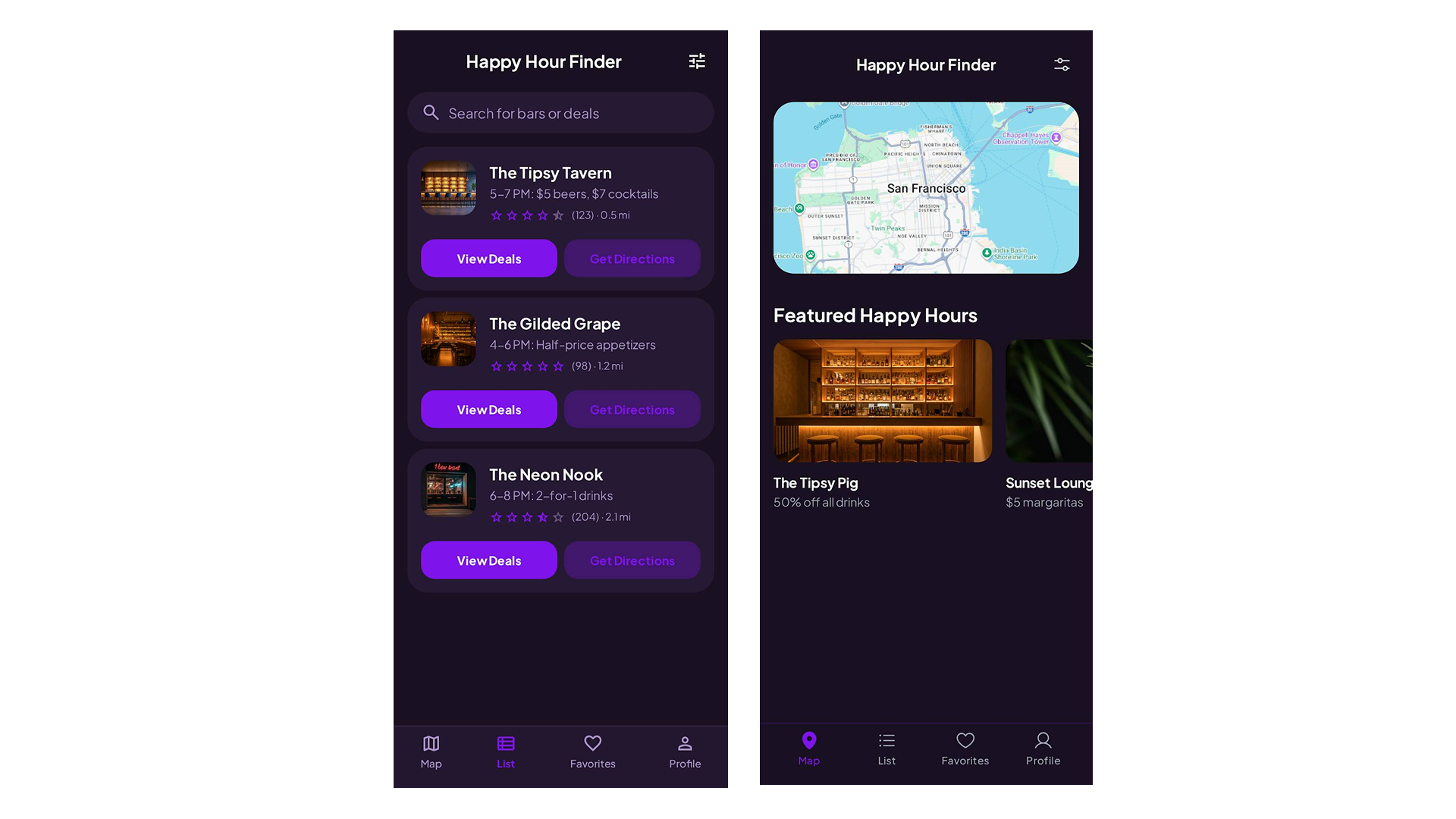 Prompt: "Create a mobile app called 'Happy Hour Finder' that helps users discover nearby bars with active happy hour deals. The style should be modern and vibrant, evening/nightlife vibe. The app should feel fun and easy to use for social planning."