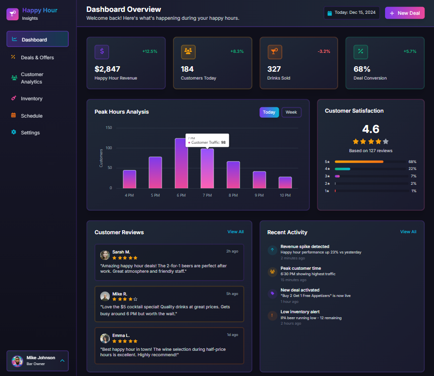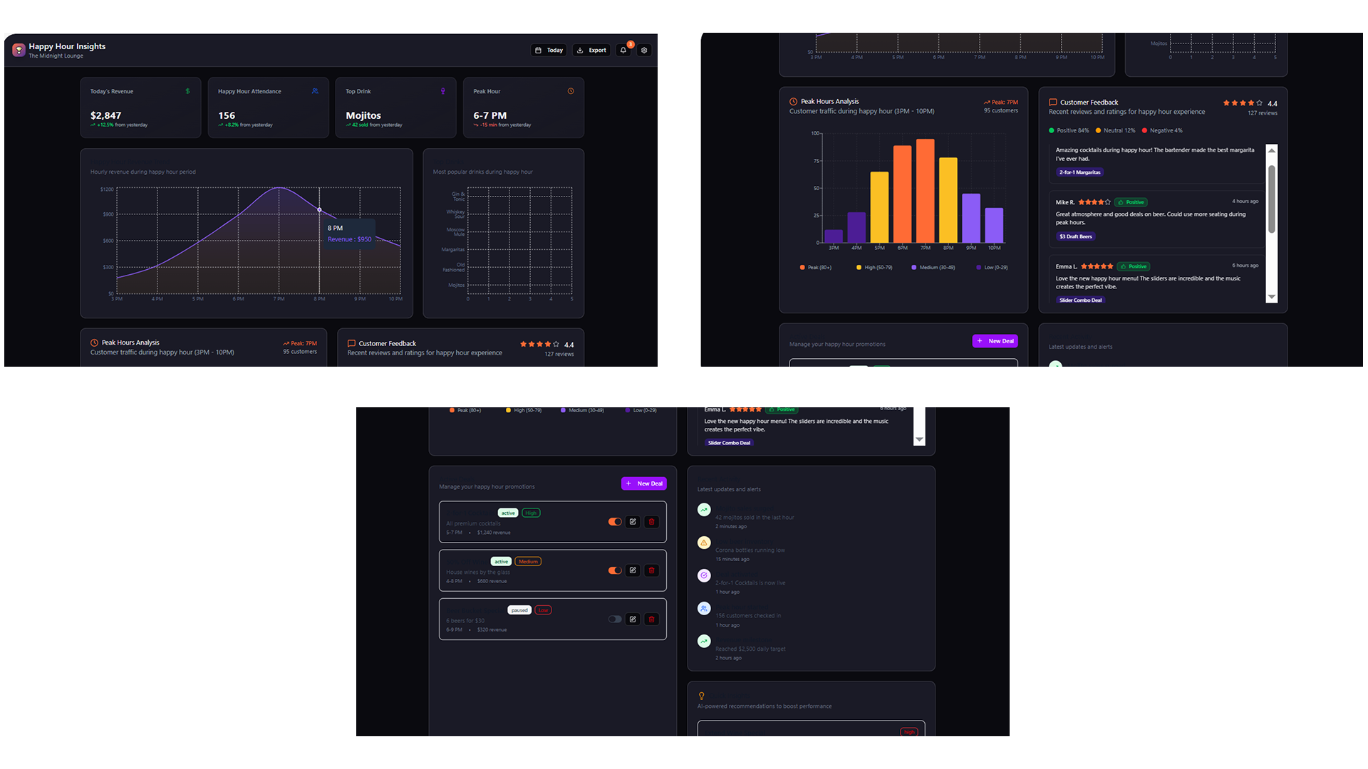 "Create a desktop dashboard called Happy Hour Insights that allows bar owners to monitor and manage their happy hour performance. Clean, data-driven UI with subtle nightlife-inspired colors. The dashboard should feel professional but lively — designed for bar owners who want to track and optimize their happy hour deals easily."
