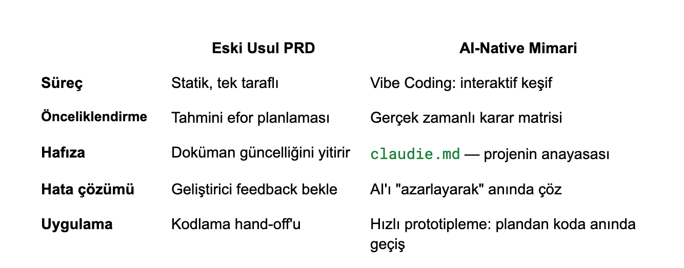 Şimdi bir de şuna bakın: Claude Code gibi araçlarla bir PM, fikir ile çalışan ürün arasındaki mesafeyi saatler içinde kapatabilir hale geldi. Buna "Vibe Coding" diyoruz — syntax bilmiyorsun ama yazılımın mantığını, bileşenlerini, API etkileşimlerini bir şef gibi yönetebiliyorsun.