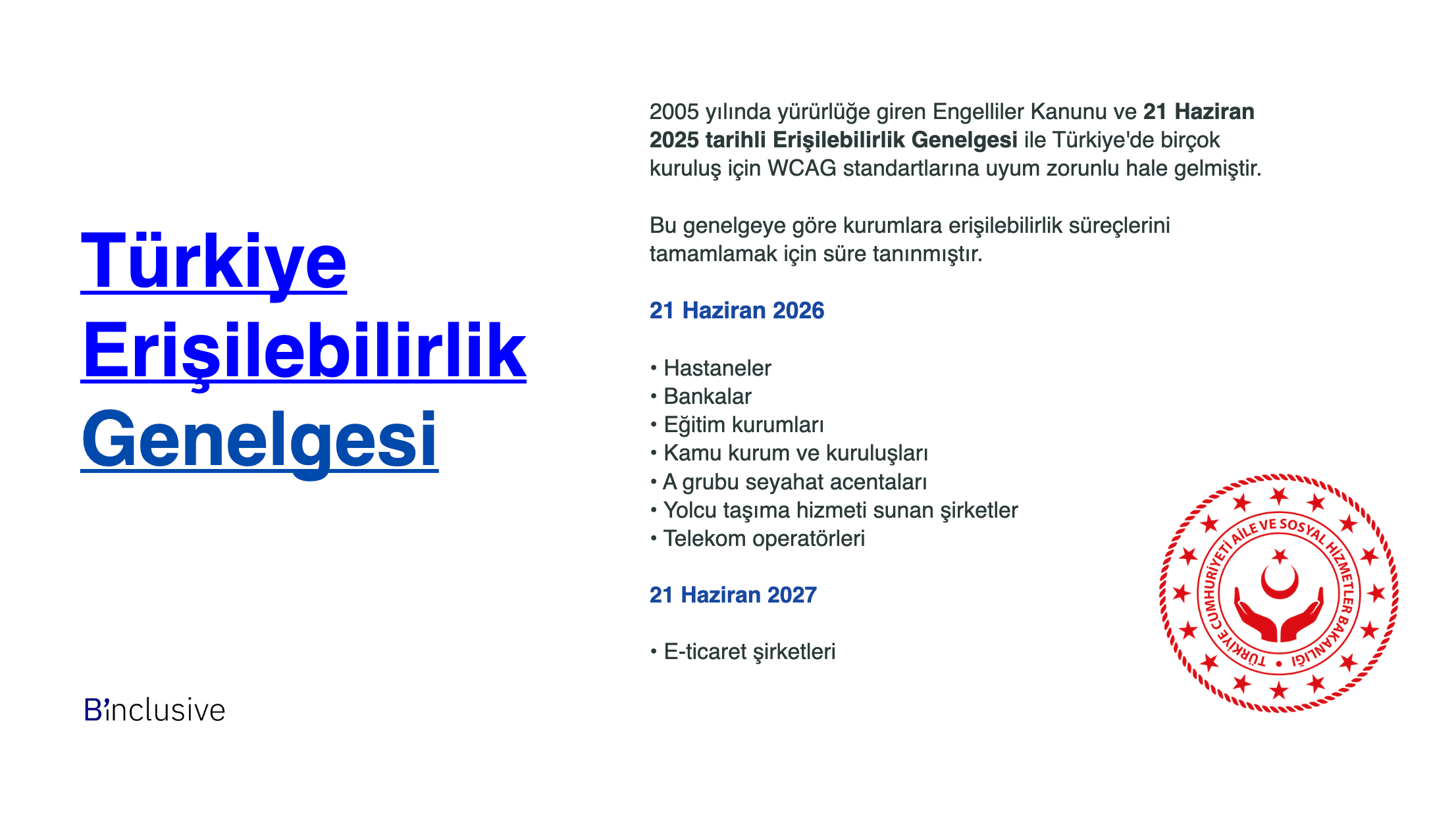 Türkiye'de de erişilebilirlik artık yasal zorunluluk.2005 yılında yürürlüğe giren 5378 sayılı Engelliler Hakkında Kanun, bilgi ve iletişim teknolojisinin erişilebilirliğini sağlamayı yasal bir gereklilik haline getirdi. 21 Haziran 2025 tarihli Erişilebilirlik Genelgesi ile ise kamu kuruluşları, üniversiteler, belediyeler, bankalar, özel hastaneler ve elektronik ticaret yapan hizmet sağlayıcılar için WCAG 2.2 standartlarına uyum zorunlu hale geldi. Kamu ve büyük özel kuruluşlar 1 yıl, e-ticaret şirketleri ise 2 yıl içinde web sitelerini ve mobil uygulamalarını bu standartlara uygun hale getirmek zorunda. Bu düzenleme, Türkiye'de yaklaşık 5 milyon engelli bireyin dijital hizmetlere eşit erişimini güvence altına alıyor.
