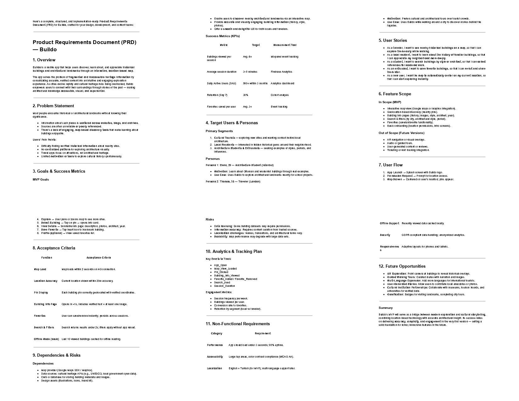 ChatGPT’nin PRD’si klasik bir ürün yöneticisinin “başlangıç taslağı” gibi. Net, kolay okunur, sade bir yapıya sahip ama pratik uygulama derinliği açısından sınırlı.
