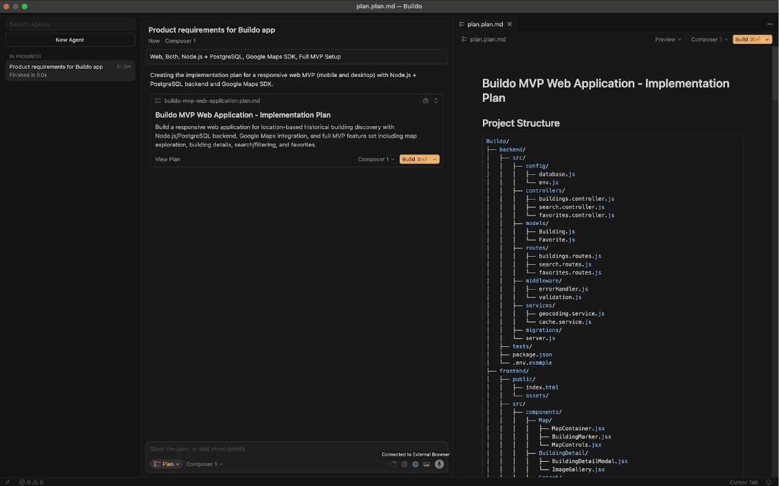 Planlamayı gerçekleştirmeden önce Cursor kullanılacak teknolojileri ve altyapıları bize soruyor. “Web, Both, Node.js + PostgreSQL, Google Maps SDK, Full MVP Setup” şeklinde yanıtlandırıyoruz. Tercihinize göre kendi projenizde farklı bir altyapı ile hareket edebilirsiniz.