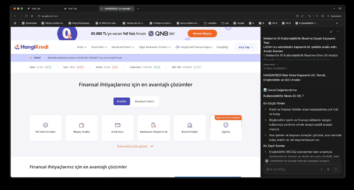 Artık yalnızca bir siteyi tarayıcılara verip yorum almaktan öteye geçmenin zamanı. Senaryoyu gerçek bir kullanıcı persona’sıyla zenginleştirerek (örneğin “X kredisini başvuran bir müşteri olduğunu düşün” gibi bir kimlik ekleyerek) analiz derinliğini artırabiliriz. Bunun yanında, tarayıcı tabanlı değerlendirmelerin ötesine geçip Gemini gibi daha “agentic” çalışan API’ları devreye almak, araçları sadece gözlem yapan değil, bağlamı genişletebilen yapılar hâline getirebilir. Böylece bu ilk turda elde ettiğimiz ön bulguları, daha tutarlı, daha nedensel ve daha gerçek bir kullanıcı deneyimine yaklaşan bir analiz hattına dönüştürme şansımız olur.